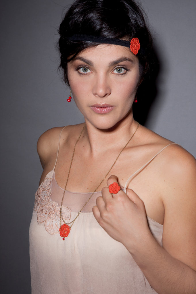 Elle se décline en un collier, un sautoir, un bracelet, deux paires de boucles d’oreilles, une bague, une barrette et un headband.